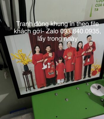 In tấm ảnh + cán màng Mika tráng gương + ép lên tấm gỗ MDF + đóng khung